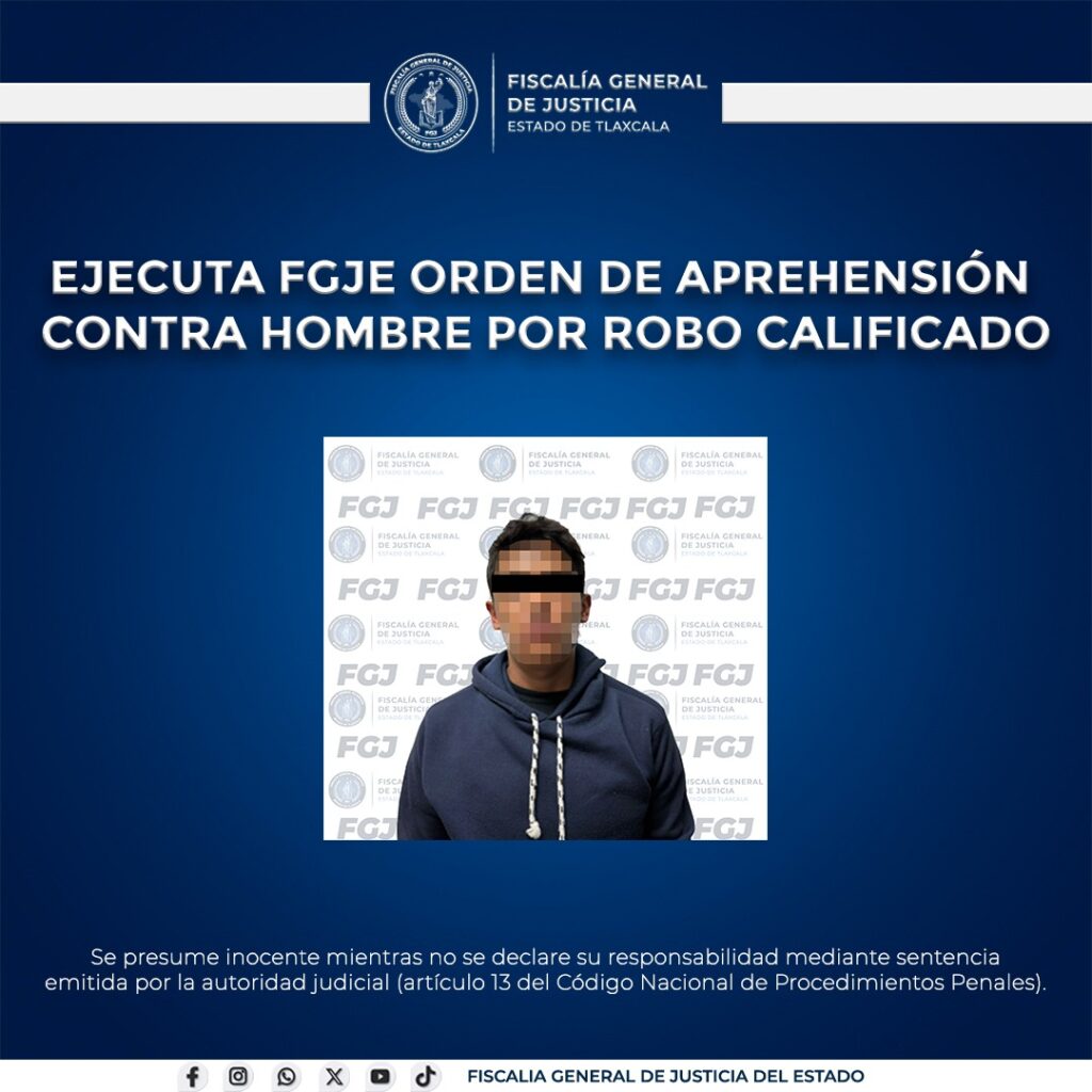 Jonathan Olvera | La Noticia de Tlaxcala Tlaxcala, Tlax., 15 de octubre de 2025.- La Fiscalía General de Justicia del Estado (FGJE) informó que agentes de la Policía de Investigación cumplimentaron una orden de aprehensión en contra de Alejandro N., señalado por el delito de robo calificado, tras una denuncia ciudadana que dio inicio al…