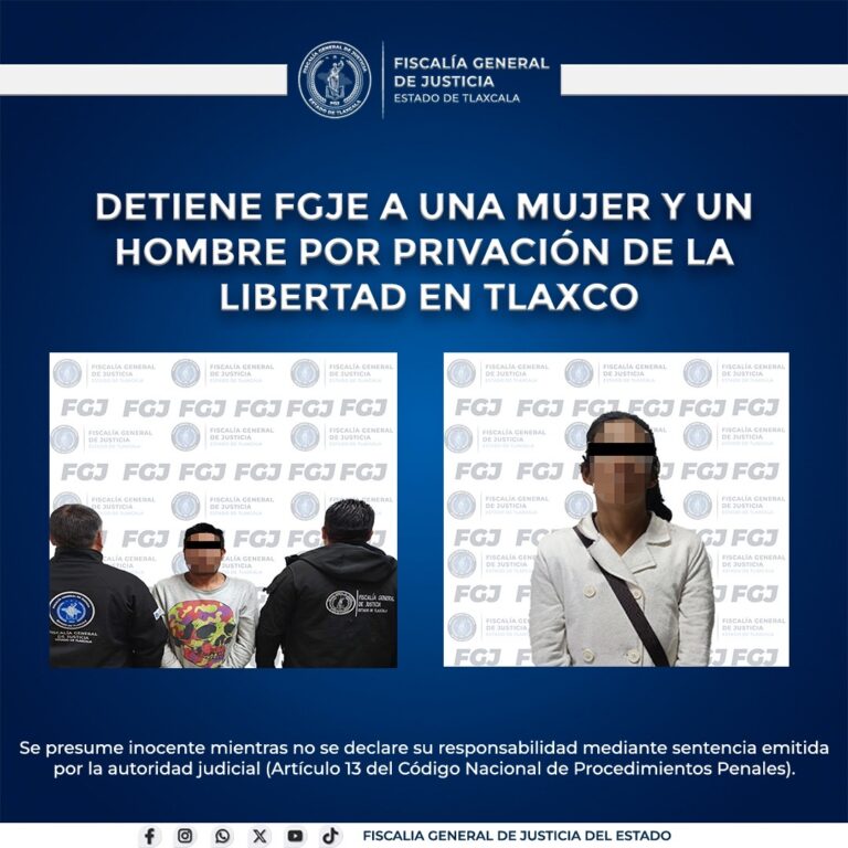 Jonathan Olvera | La Noticia de Tlaxcala Tlaxco, Tlax., 23 de febrero de 2026.- Derivado de trabajos de campo y gabinete, la Fiscalía General de Justicia del Estado de Tlaxcala detuvo a Marisol N. y Óscar N., señalados por su probable responsabilidad en el delito de privación de la libertad personal, cometido en este municipio….