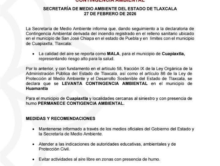 Guillermo Veloz | La Noticia de Tlaxcala Huamantla, Tlax., 27 de febrero de 2026.- El Gobierno Municipal de Huamantla informó el levantamiento de la contingencia ambiental en el municipio, luego del seguimiento realizado por la Secretaría de Medio Ambiente del Estado de Tlaxcala tras el incendio registrado en el relleno sanitario ubicado en San José…