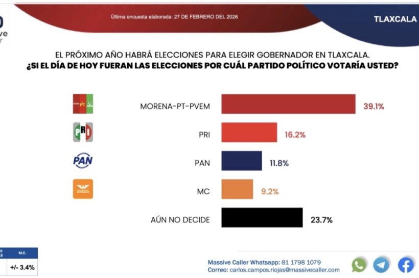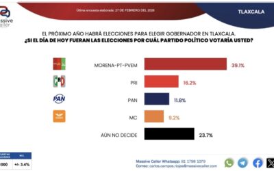 Jonathan Olvera | La Noticia de Tlaxcala Tlaxcala, 27 de febrero de 2026. — La más reciente encuesta de la firma Massive Caller revela que la coalición Morena–PT–PVEM se mantiene al frente en la intención del voto rumbo a la elección de gubernatura en Tlaxcala. De acuerdo con el ejercicio demoscópico, si hoy fueran las…
