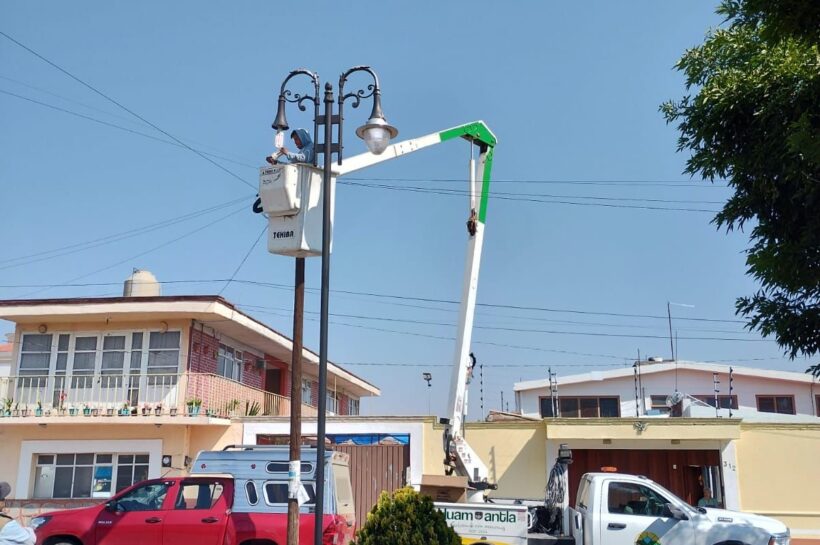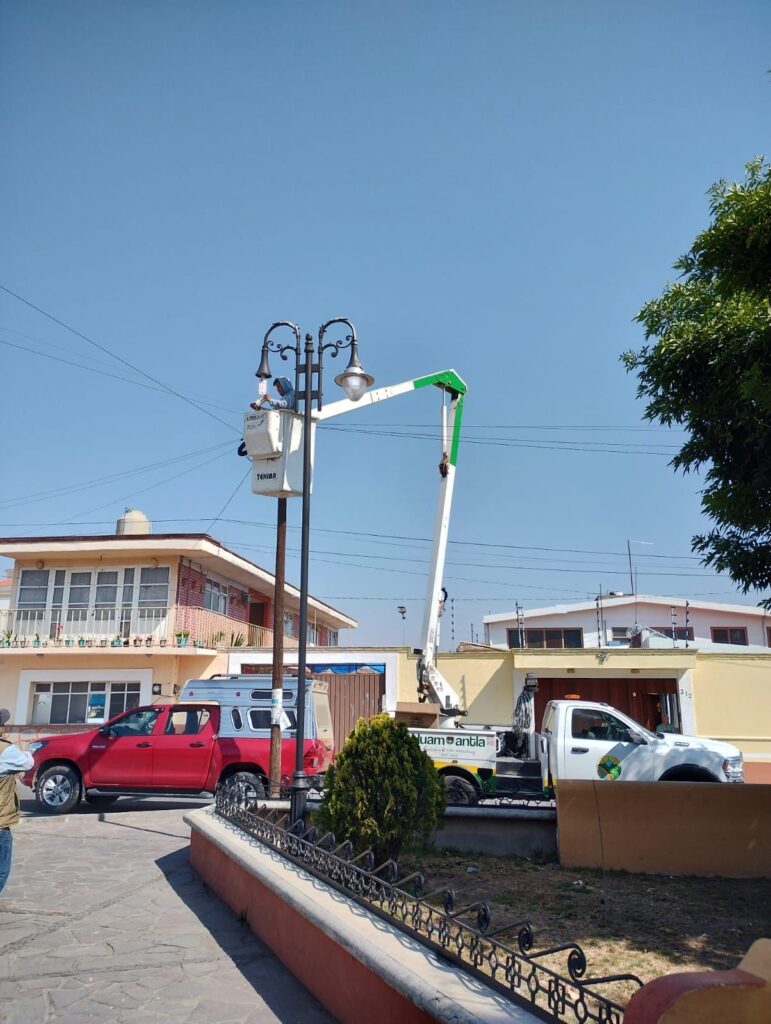 Brigadas “Huamantla Brilla Más” reparan luminarias en la Plazuela de Jesús