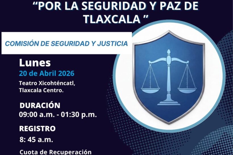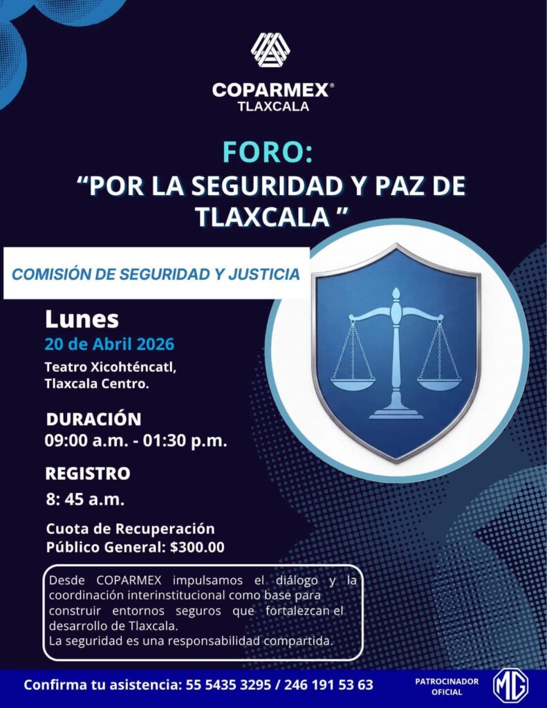 * Será el lunes en el Teatro Xicohténcatl Guillermo Veloz/ La Noticia de Tlaxcala Tlaxcala, Tlax., 18 de abril 2026.- La Confederación Patronal de la República Mexicana (Coparmex) Tlaxcala, a través de la Comisión de Seguridad y Justicia, realizará este lunes 20 de abril, el Foro “Por la Seguridad y Paz de Tlaxcala” Este foro…