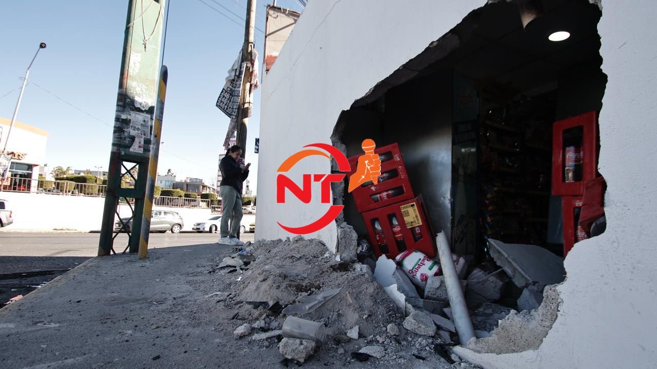 El fuerte choque dejó esparcidos vidrios, plásticos y diversas partes de la carrocería sobre la vialidad, además de provocar daños a mercancía del negocio, entre ellas rejillas de refresco y un refrigerador.