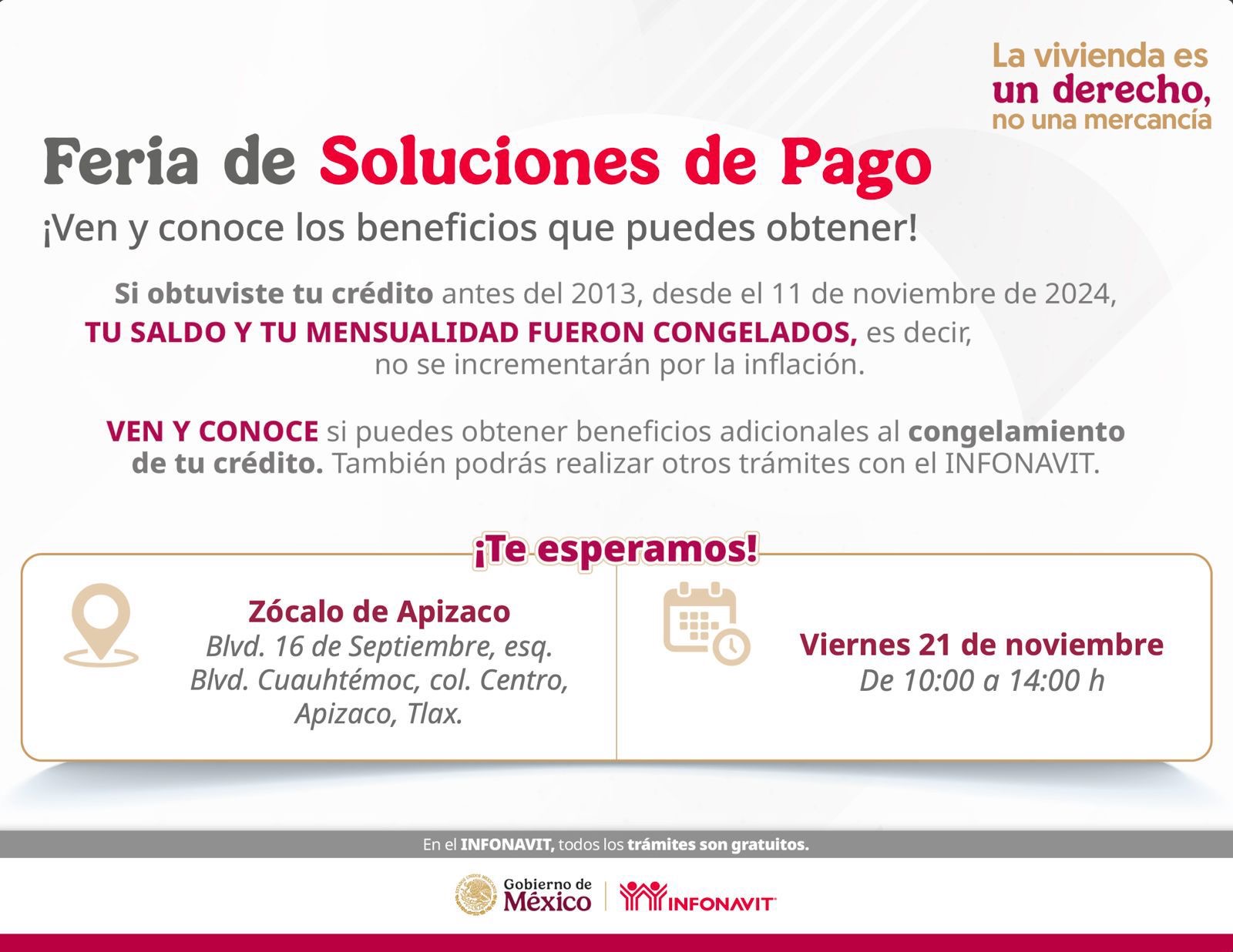 Apizaco, Tlax., 19 de noviembre de 2025.- En una apuesta por fortalecer la economía de las familias del norte del estado, el Ayuntamiento de Apizaco, encabezado por el presidente municipal Javier Rivera Bonilla, anunció la realización de la Feria de Soluciones de Pago del Infonavit, un esfuerzo interinstitucional para ofrecer alternativas financieras y asesoría directa a trabajadores con créditos vigentes.