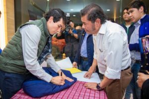 Apizaco, Tlax., 7 de marzo de 2026.- En un ambiente de entusiasmo, cercanía y pasión por la fiesta brava, la ciudad de Apizaco vivió una jornada especial con la realización de una rueda de prensa y firma de autógrafos encabezada por los reconocidos toreros Isaac Fonseca y Diego San Román, como parte de las actividades previas a los eventos taurinos de la Feria Apizaco 2026, denominada “Una Feria a Toda Máquina”.