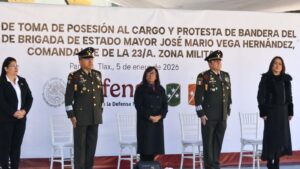 PANOTLA, TLAX., 05 de enero 2026.- El General de Brigada, Diplomado de Estado Mayor, José Mario Vega Hernández, tomó posesión y protesta de bandera como nuevo comandante de la 23 Zona Militar de Tlaxcala, en sustitución de Martín Jaramillo Barrios, ceremonia que se llevo a cabo en las instalaciones del Primer Regimiento, ubicado en el Campo Militar del municipio de Panotla, la cual estuvo encabezada por la Gobernadora, Lorena Cuellar Cisneros, acompañada del General, Héctor Ávila Alcocer, comandante de la Sexta Región Militar.