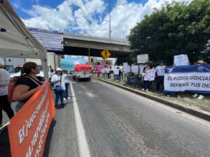 Asimismo, los manifestantes bloquearon parcialmente la circulación vial en la entrada principal del municipio sarapero con automóviles y más pancartas, exigiendo a las autoridades no vender el Poder Judicial, evitar la reforma y dejando pasar lentamente a los automóviles.