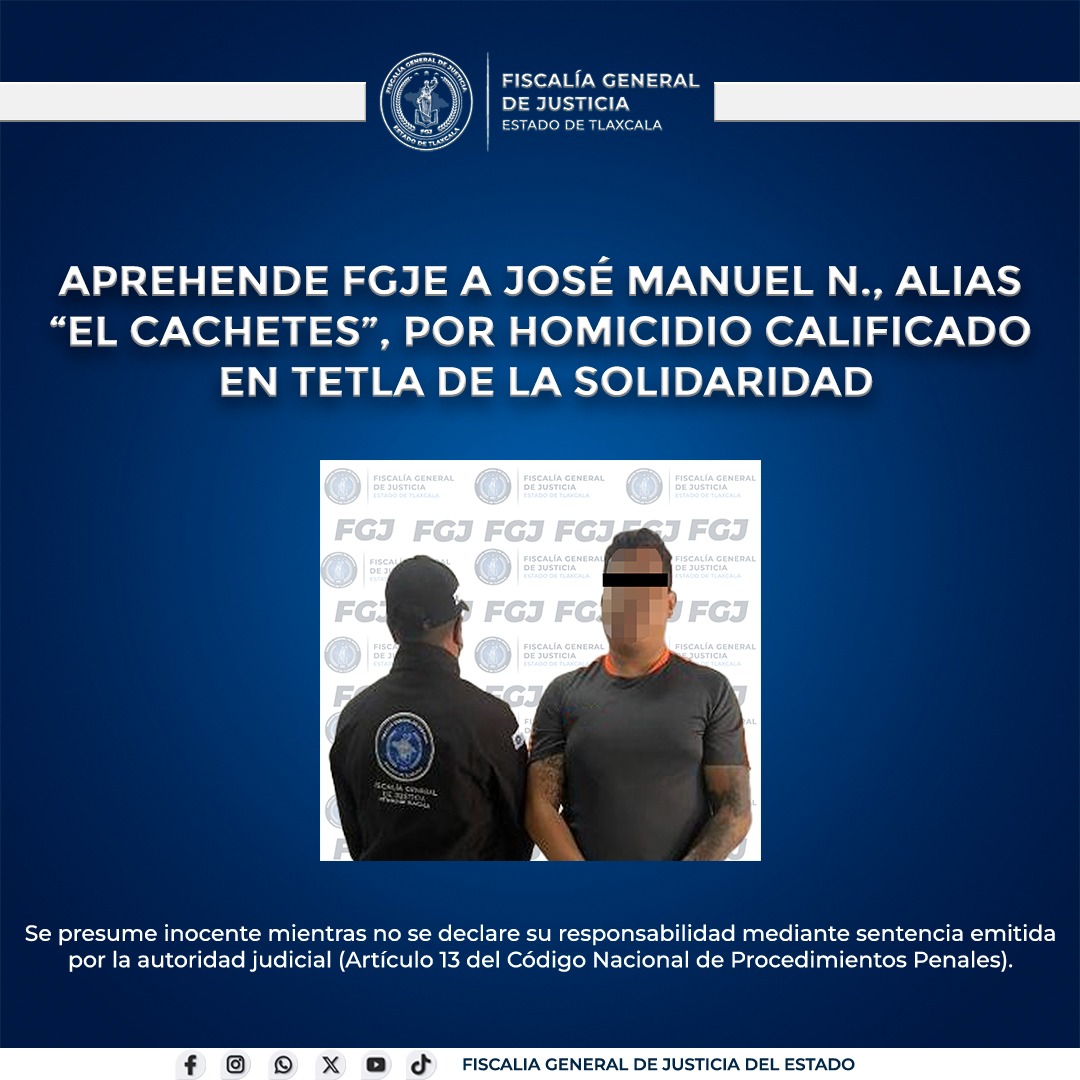 Tlaxcala, Tlax., 18 de marzo de 2026.- La Fiscalía General de Justicia del Estado (FGJE) cumplimentó una orden de aprehensión en contra de José Manuel N., alias “El Cachetes”, señalado como probable responsable del delito de homicidio calificado, derivado de un hecho ocurrido en el municipio de Tetla de la Solidaridad.