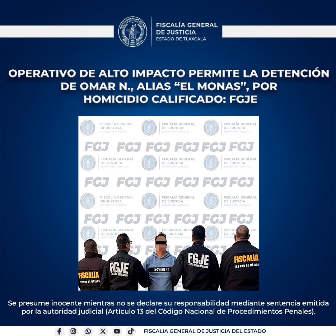 Tlaxcala, Tlax., 8 de diciembre de 2025.- En un operativo de alto impacto y resultado de una estrecha colaboración interinstitucional, la Fiscalía General de Justicia del Estado (FGJE) y la Fiscalía General de Justicia del Estado de México (FGJEM) concretaron la detención de Omar N., alias “El Monas”, señalado como un objetivo prioritario por su presunta participación en un homicidio calificado ocurrido en territorio mexiquense.