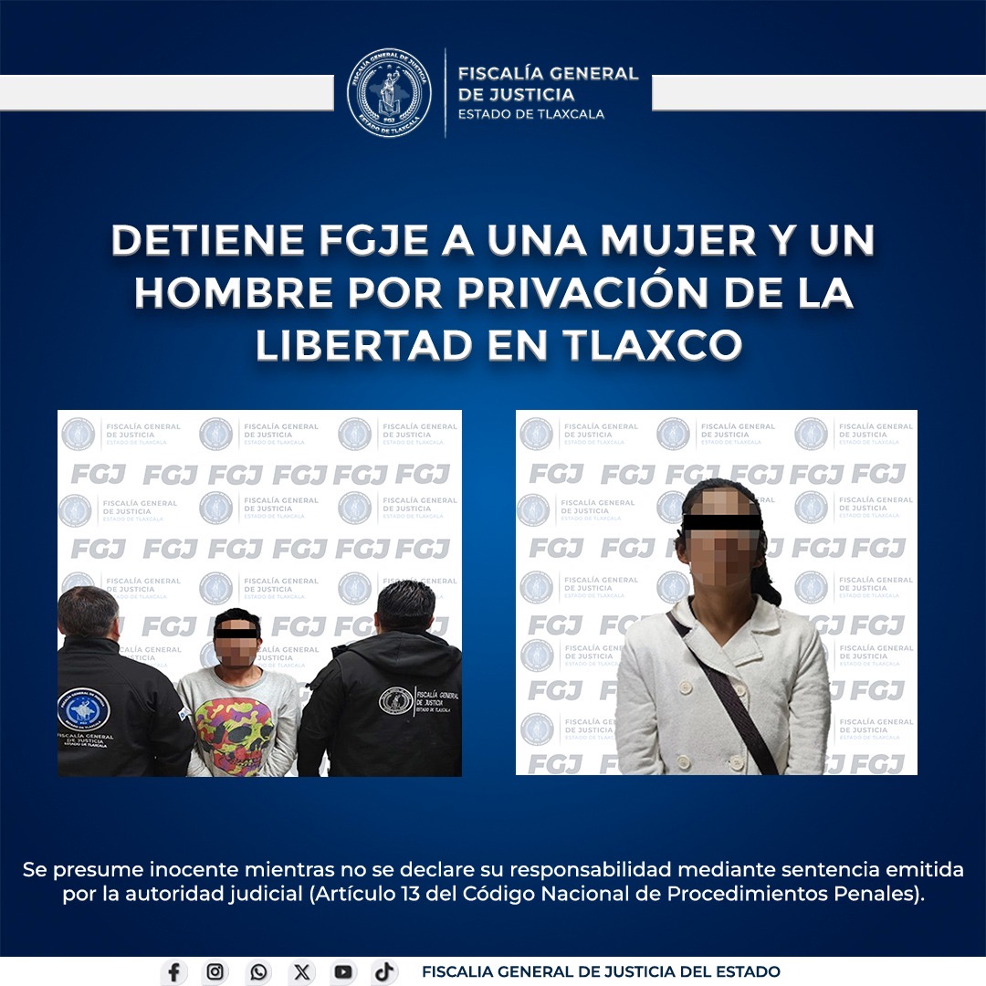 Tlaxco, Tlax., 23 de febrero de 2026.- Derivado de trabajos de campo y gabinete, la Fiscalía General de Justicia del Estado de Tlaxcala detuvo a Marisol N. y Óscar N., señalados por su probable responsabilidad en el delito de privación de la libertad personal, cometido en este municipio.