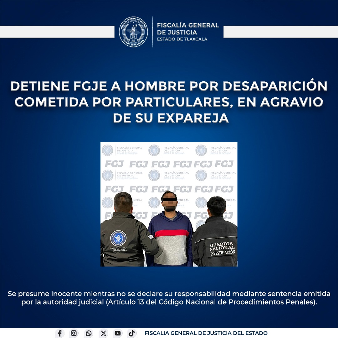 Tlaxcala, Tlax., 11 de noviembre de 2025.- La Fiscalía General de Justicia del Estado (FGJE) informó la detención de Fernando N., acusado del delito de desaparición cometida por particulares, en agravio de su expareja, quien fue privada de la libertad y posteriormente localizada sin vida.