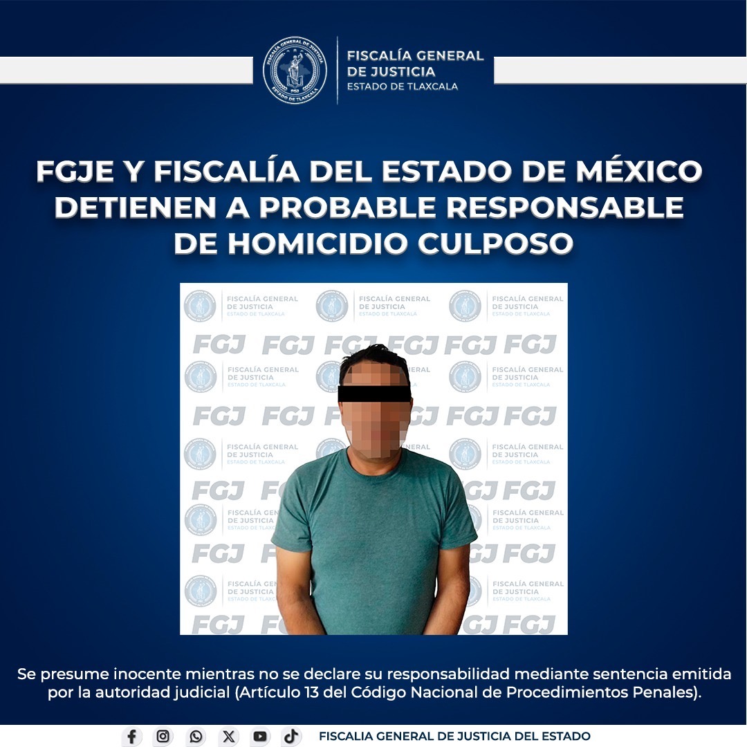 Tlaxcala, Tlax., 23 de febrero de 2026.- En una acción coordinada entre la Fiscalía General de Justicia del Estado de Tlaxcala y la Fiscalía General de Justicia del Estado de México, fue detenido José de Jesús N., señalado como probable responsable del delito de homicidio culposo, derivado de un hecho de tránsito registrado en el Estado de México.