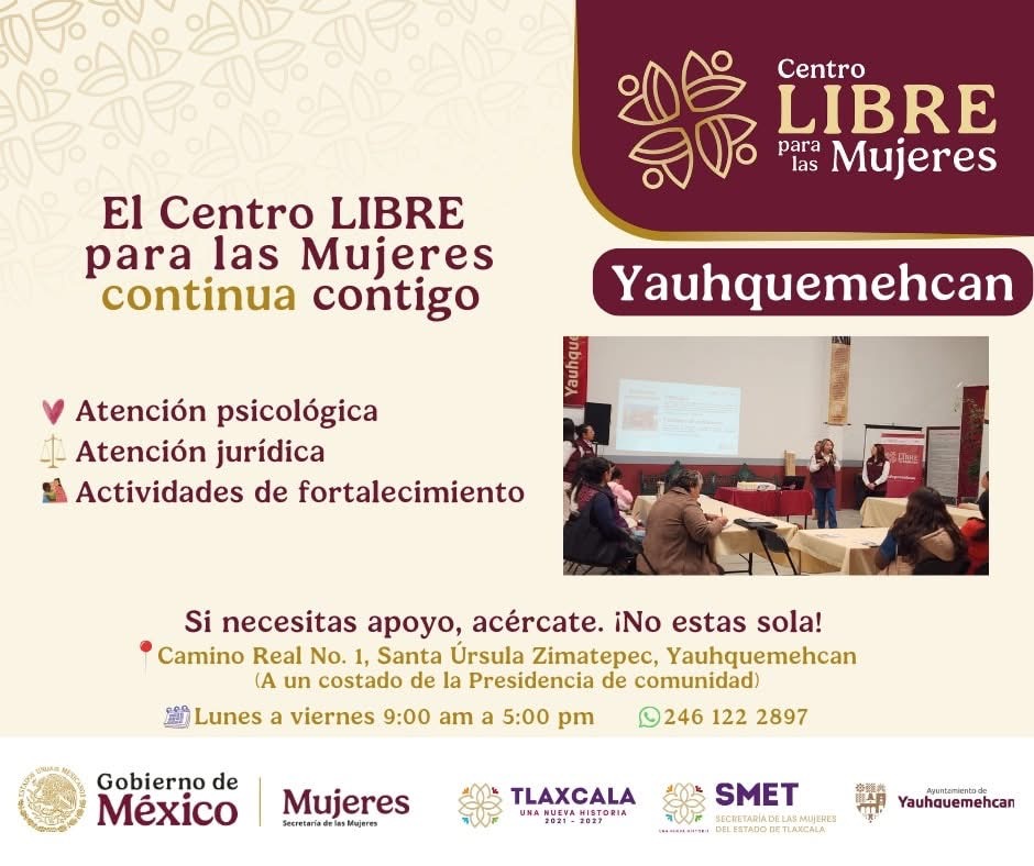 Finalmente, se invitó a la población femenina a acercarse, informarse y compartir esta información con otras mujeres, fortaleciendo así la sororidad y el cuidado colectivo. Esta acción se realiza en coordinación con la Secretaría de las Mujeres del Estado de Tlaxcala y el Ayuntamiento de Yauhquemehcan, como parte de una estrategia permanente para construir comunidades más seguras y solidarias.