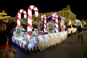 La celebración dio inicio frente a Casa Huamantla, donde la Fundación Te Soñé presentó un nacimiento monumental acompañado por la interpretación de villancicos del Coro de Niños Cantores de San Luis Obispo, que llenó el lugar de emoción y calidez.