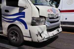 Tlaxcala, Tlax., 1 de octubre de 2025. – La tarde de este miércoles se registró un accidente vial sobre la avenida Independencia, en la capital tlaxcalteca, donde estuvieron involucradas dos unidades de transporte público —de las rutas Panzacola–Tlaxcala y Santo Toribio–Tlaxcala— y un vehículo particular Aveo color negro, a la altura de los laboratorios Bio Diagnostics.
