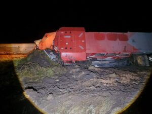 Tlaxco, Tlax., 22 de octubre de 2025.- La madrugada de este miércoles, un convoy de 17 vagones de Ferromex sufrió un aparatoso descarrilamiento en los límites entre Tlaxco, Tlaxcala, y el estado de Hidalgo, dejando como saldo tres elementos de seguridad lesionados y daños materiales millonarios.