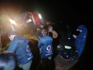 Paramédicos de Protección Civil de Tlaxco atendieron a los lesionados y colaboran con corporaciones locales en las labores de rescate y retiro de vagones, que avanzan con resguardo de autoridades.