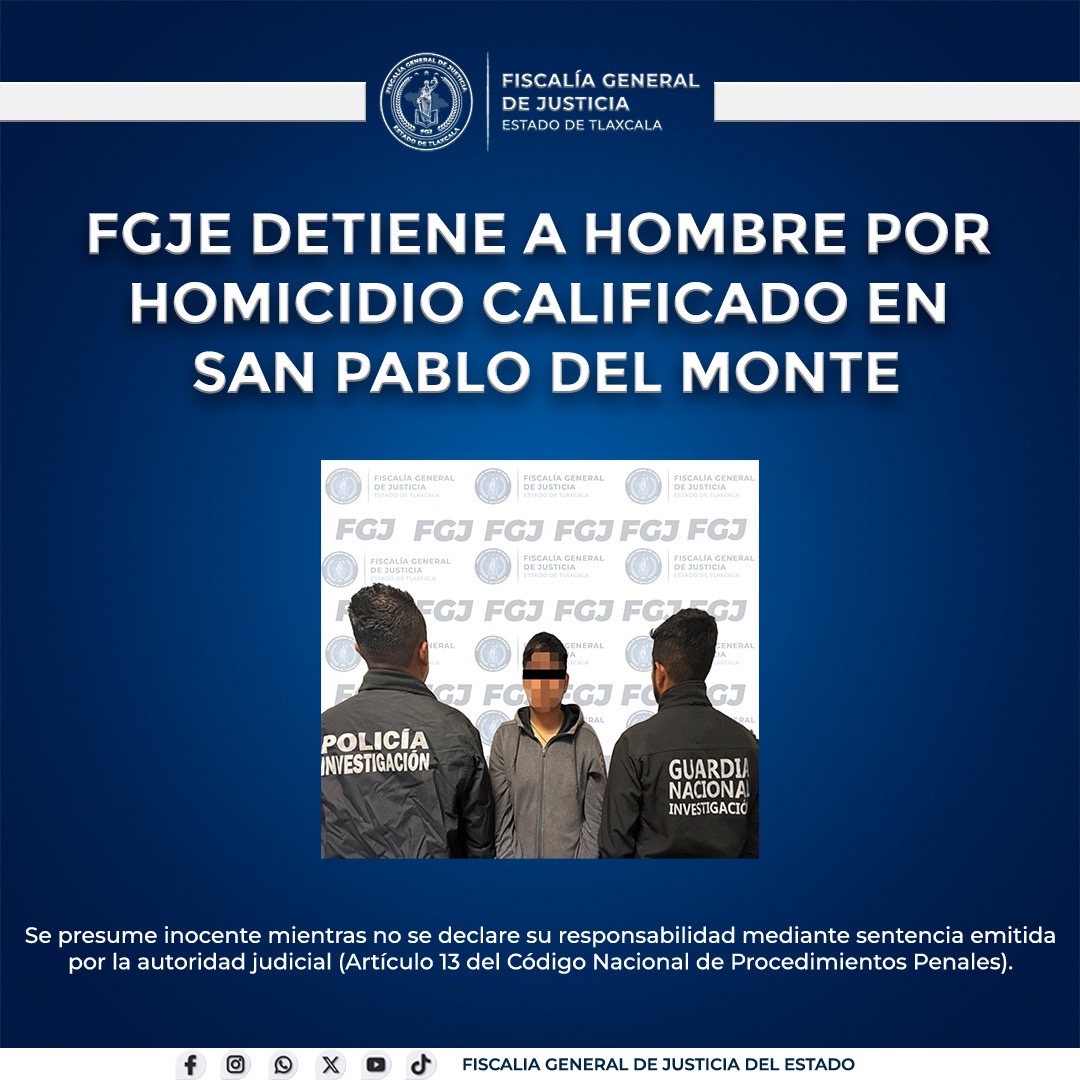 San Pablo del Monte, Tlax., 4 de marzo de 2026.— La Fiscalía General de Justicia del Estado (FGJE), a través de la Policía de Investigación, detuvo a Erick N., señalado como presunto responsable del delito de homicidio calificado, ocurrido en el municipio de San Pablo del Monte.