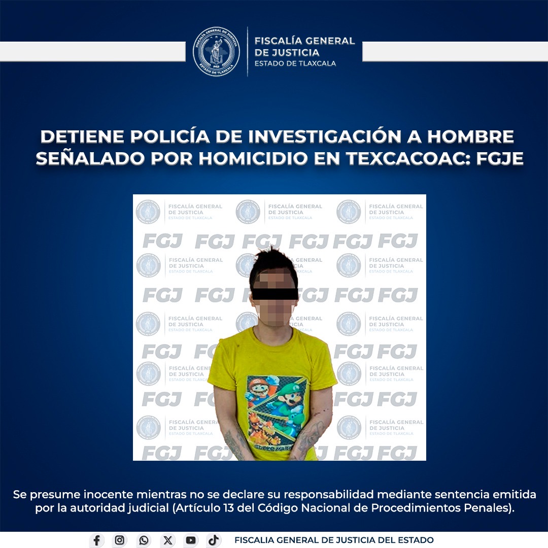Chiautempan, Tlax., 5 de noviembre de 2025.- La Fiscalía General de Justicia del Estado (FGJE) informó la detención de Juan Alberto N., alias “Samarripa”, señalado como probable responsable del homicidio ocurrido el pasado 8 de octubre en el barrio de Texcacóac.