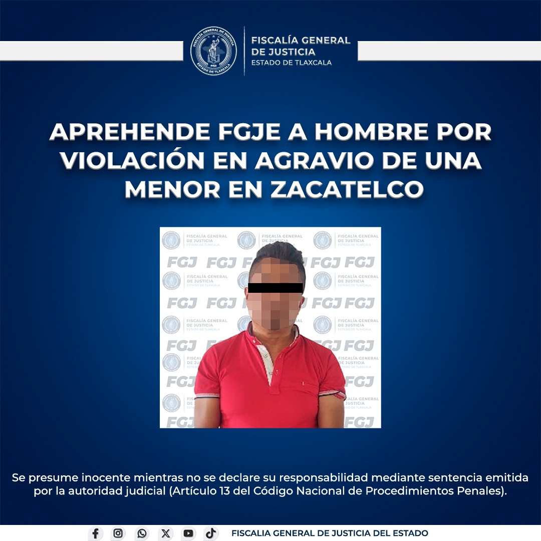 Tlaxcala, Tlax., 7 de octubre de z2025.- La Fiscalía General de Justicia del Estado (FGJE) informó que elementos de la Policía de Investigación cumplimentaron una orden de aprehensión en contra de Miguel Ángel N., por su presunta responsabilidad en el delito de abuso cometido en agravio de una menor de edad.