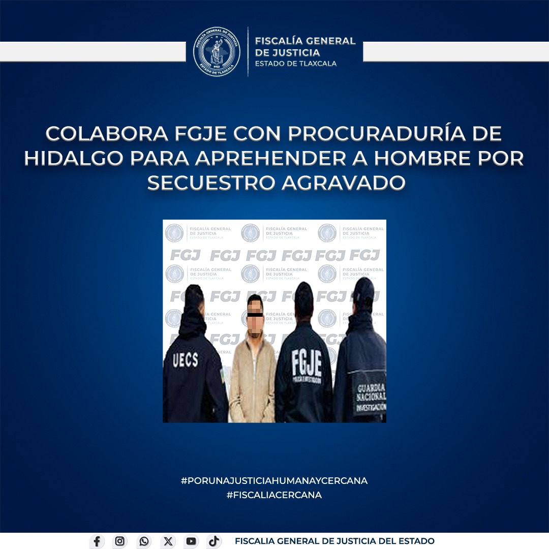 Tlaxcala, Tlax., 6 de octubre de 2025.- La Fiscalía General de Justicia del Estado (FGJE) de Tlaxcala reafirmó su compromiso con la procuración de justicia al colaborar con la Procuraduría General de Justicia del Estado de Hidalgo (PGJEH) en la aprehensión de Juan Carlos N., señalado por su presunta participación en el delito de secuestro agravado.
