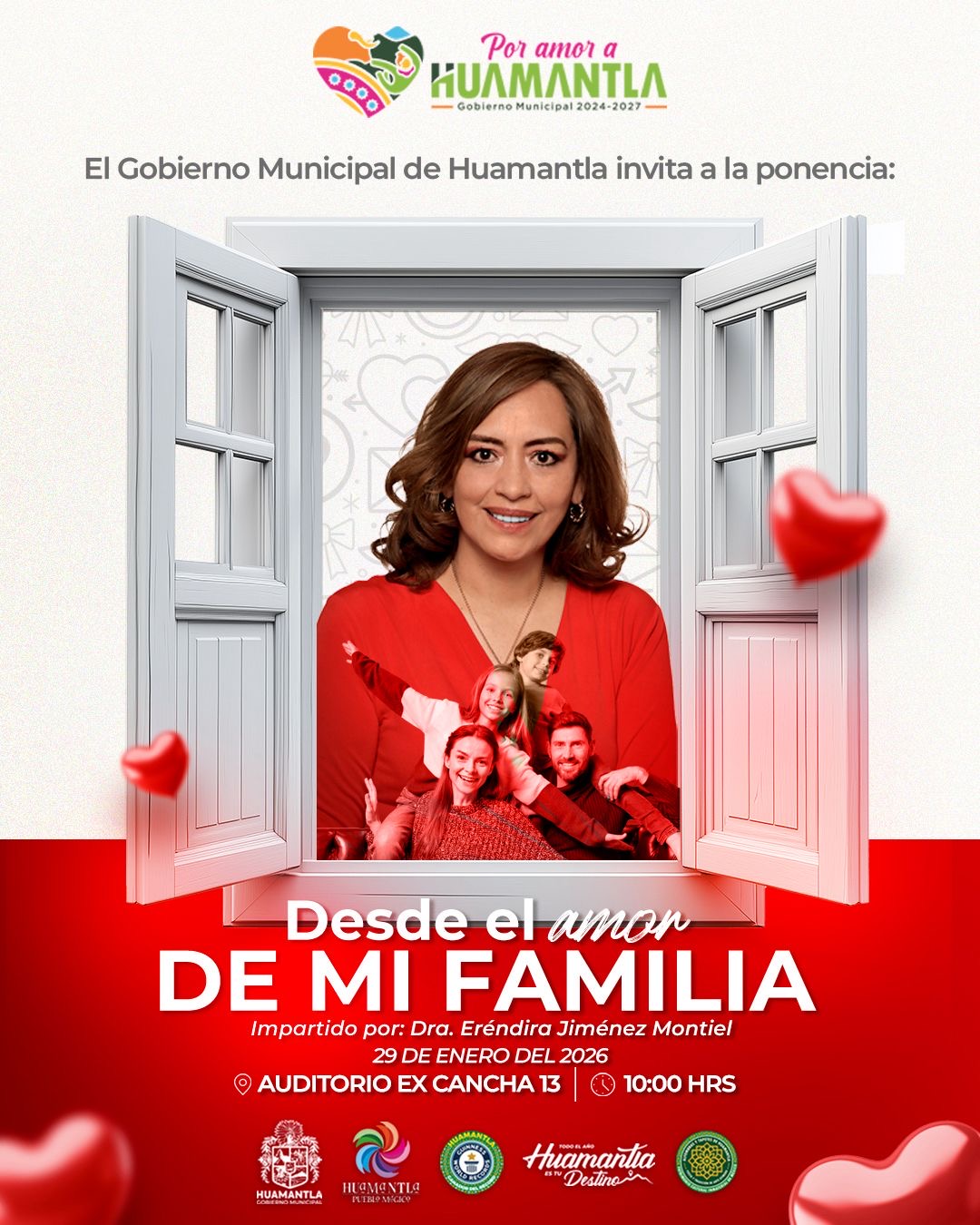 Huamantla, Tlax., 28 de enero de 2026.- Con el objetivo de fortalecer los lazos familiares y promover una cultura de respeto, cuidado y bienestar dentro del hogar, el Gobierno Municipal de Huamantla, a través de la Dirección de Bienestar Municipal, invita a la ciudadanía a participar en la ponencia “Desde el amor de mi familia”, que será impartida por la Dra. Eréndira Jiménez Montiel, reconocida activista en favor de los derechos humanos.