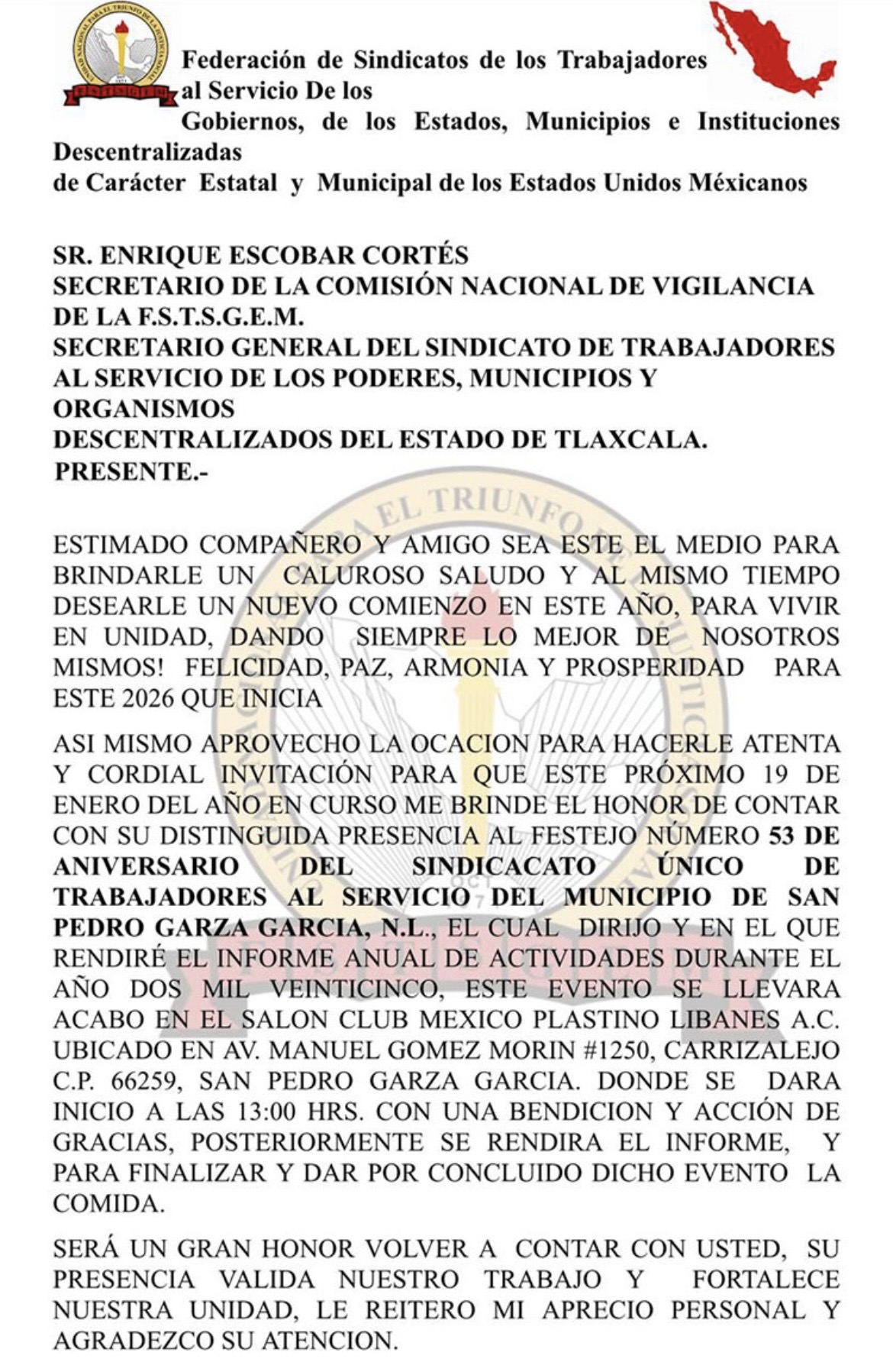 Lo anterior se desprende de un documento oficial emitido por la propia federación, en el que se reconoce a Escobar Cortés no solo como secretario general del Sindicato de Trabajadores al Servicio de los Poderes, Municipios y Organismos Descentralizados del Estado de Tlaxcala, sino también como integrante de la Comisión Nacional de Vigilancia, omitiendo cualquier referencia a Karina Erazo como dirigente sindical.