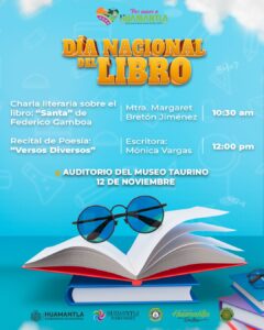 Huamantla, Tlax., 11 de noviembre de 2025. – Con el propósito de fomentar el gusto por la lectura y promover la cultura como una herramienta de transformación social, el H. Ayuntamiento de Huamantla, a través de la Dirección de Turismo, Cultura y Desarrollo Taurino y la Coordinación de Cultura, anunció una semana de actividades culturales para conmemorar el Día Nacional del Libro, del 12 al 18 de noviembre en distintos espacios del municipio.
