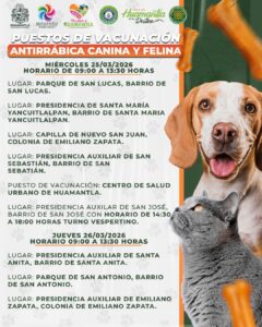 Huamantla, Tlax., 25 de marzo de 2026.– Con el objetivo de prevenir enfermedades y fortalecer la salud pública, el Gobierno Municipal de Huamantla, en coordinación con el Centro de Salud Urbano, puso en marcha la Jornada de Vacunación Antirrábica Canina y Felina, que se desarrollará del 25 al 28 de marzo en distintos puntos del municipio.
