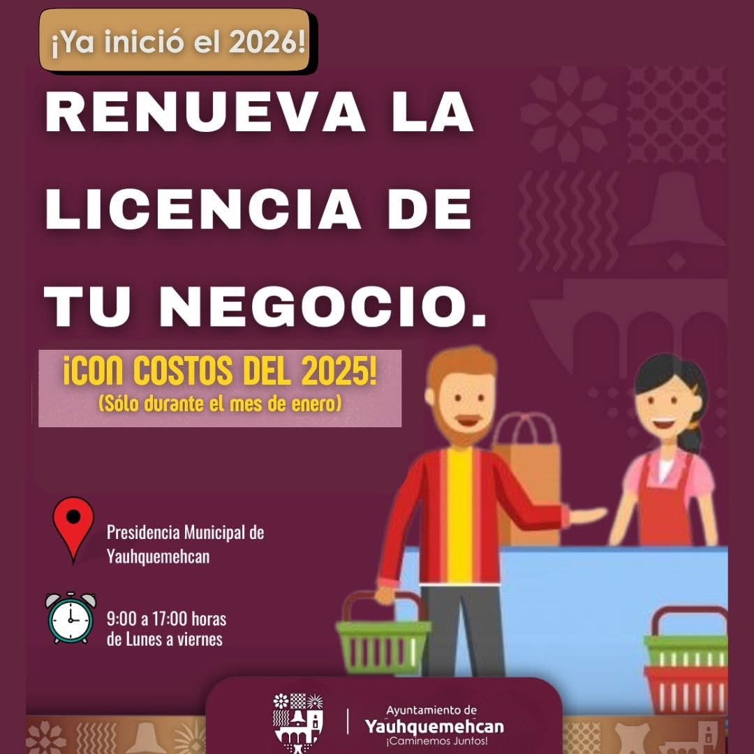 Yauhquemehcan, Tlax., 8 de enero de 2026.- La Coordinación de Desarrollo Económico del municipio de Yauhquemehcan invitó a comerciantes, empresarias y empresarios a aprovechar los beneficios vigentes durante el mes de enero de 2026 para realizar el refrendo de sus licencias de funcionamiento, manteniendo los costos correspondientes al año 2025.