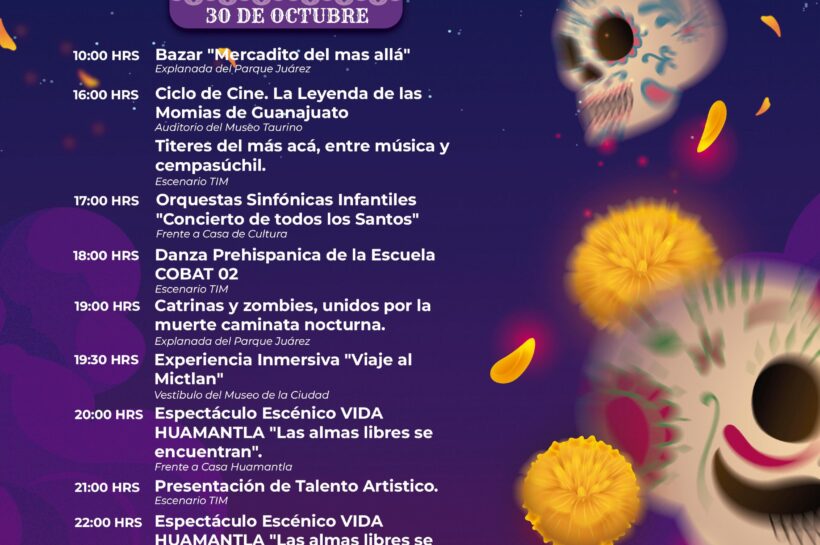 Redacción | La Noticia de Tlaxcala Huamantla, Tlax., 30 de octubre de 2025.– El Ayuntamiento de Huamantla anunció una jornada llena de color, arte y cultura con el programa “Vida Huamantla”, un festival que honra las tradiciones del Día de Muertos y celebra la identidad de este Pueblo Mágico. Desde las 10:00 hasta las 22:00…