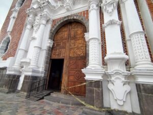 Tlaxcala, Tlax., 26 de noviembre de 2025.—El Santuario de San José, uno de los recintos religiosos más emblemáticos de la capital tlaxcalteca, mantiene cerrada una de sus puertas desde hace varios días debido a trabajos de mantenimiento que se realizan al interior del templo. De igual manera, una de las capillas permanece sin acceso por las mismas labores de intervención.