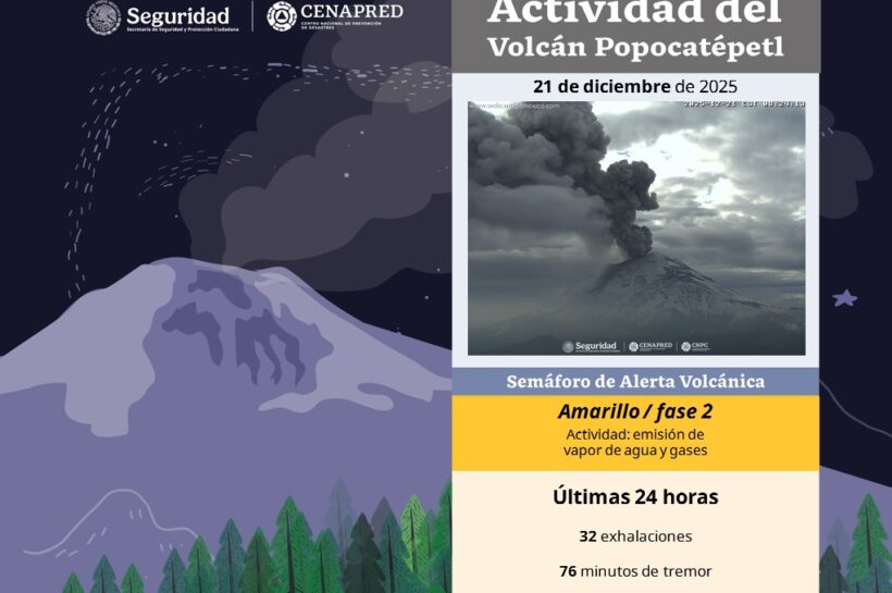 Autoridades reportan exhalaciones, tremor y exhortan a la población a seguir recomendaciones preventivas Jonathan Olvera | La Noticia de Tlaxcala Puebla/Tlax., 21 de diciembre de 2025.- El Volcán Popocatépetl registró intensa actividad durante la mañana de este día, con la expulsión constante de vapor de agua, ceniza y otros componentes químicos, de acuerdo con el…