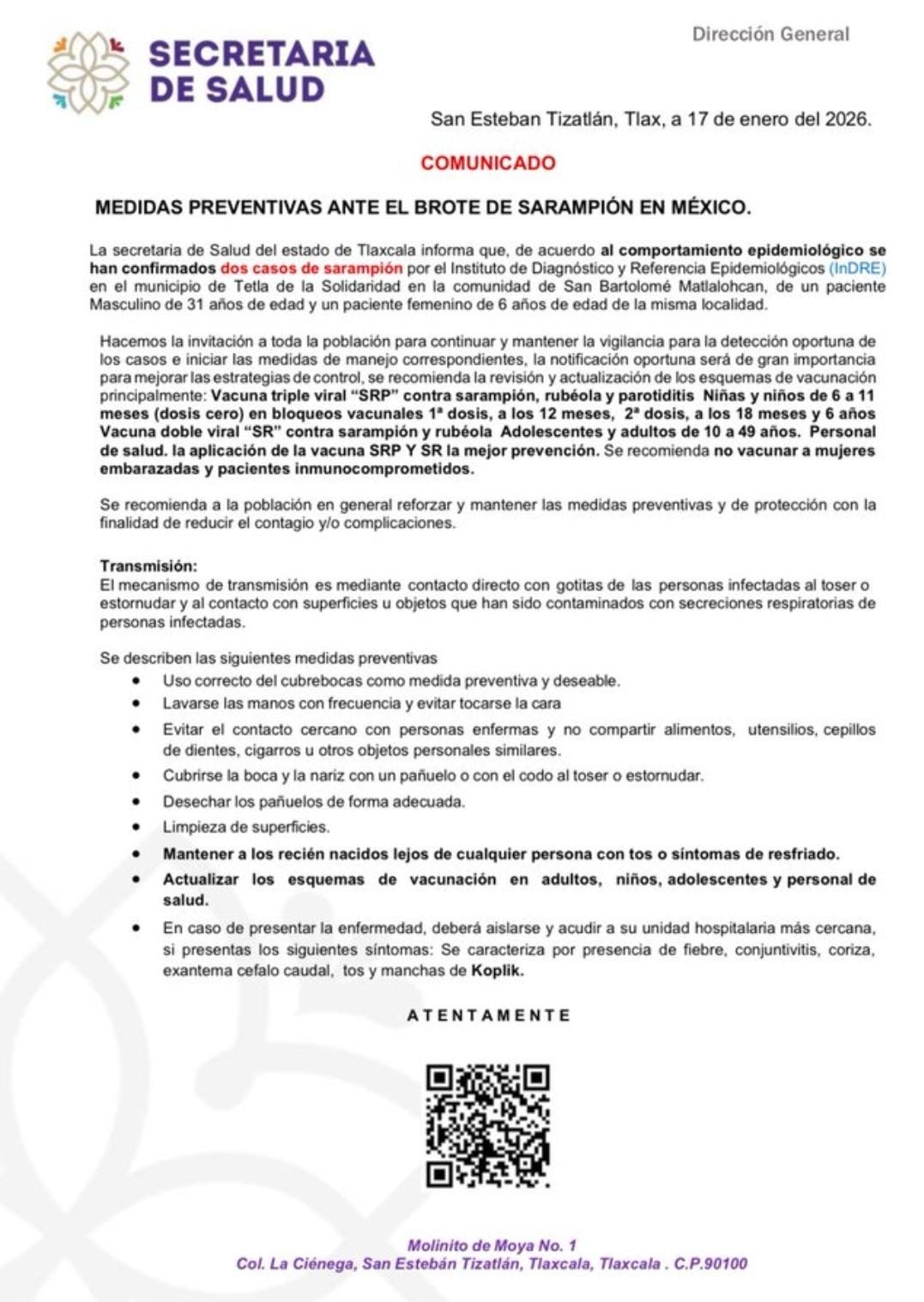 San Esteban Tizatlán, Tlax., 17 de enero de 2026.— La Secretaría de Salud del estado de Tlaxcala informó la confirmación de dos casos de sarampión en el municipio de Tetla de la Solidaridad, específicamente en la comunidad de San Bartolomé Matlalohcan, de acuerdo con resultados del Instituto de Diagnóstico y Referencia Epidemiológicos (InDRE).