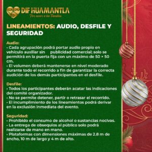 El SMDIF detalló que las unidades inscritas deberán cumplir especificaciones de seguridad y audio: un ancho máximo de 2.8 metros, longitud de 10 metros y altura máxima de 4 metros. Cada agrupación podrá portar audio propio manteniendo volumen moderado durante todo el recorrido. Está estrictamente prohibido el consumo de alcohol o sustancias nocivas.
