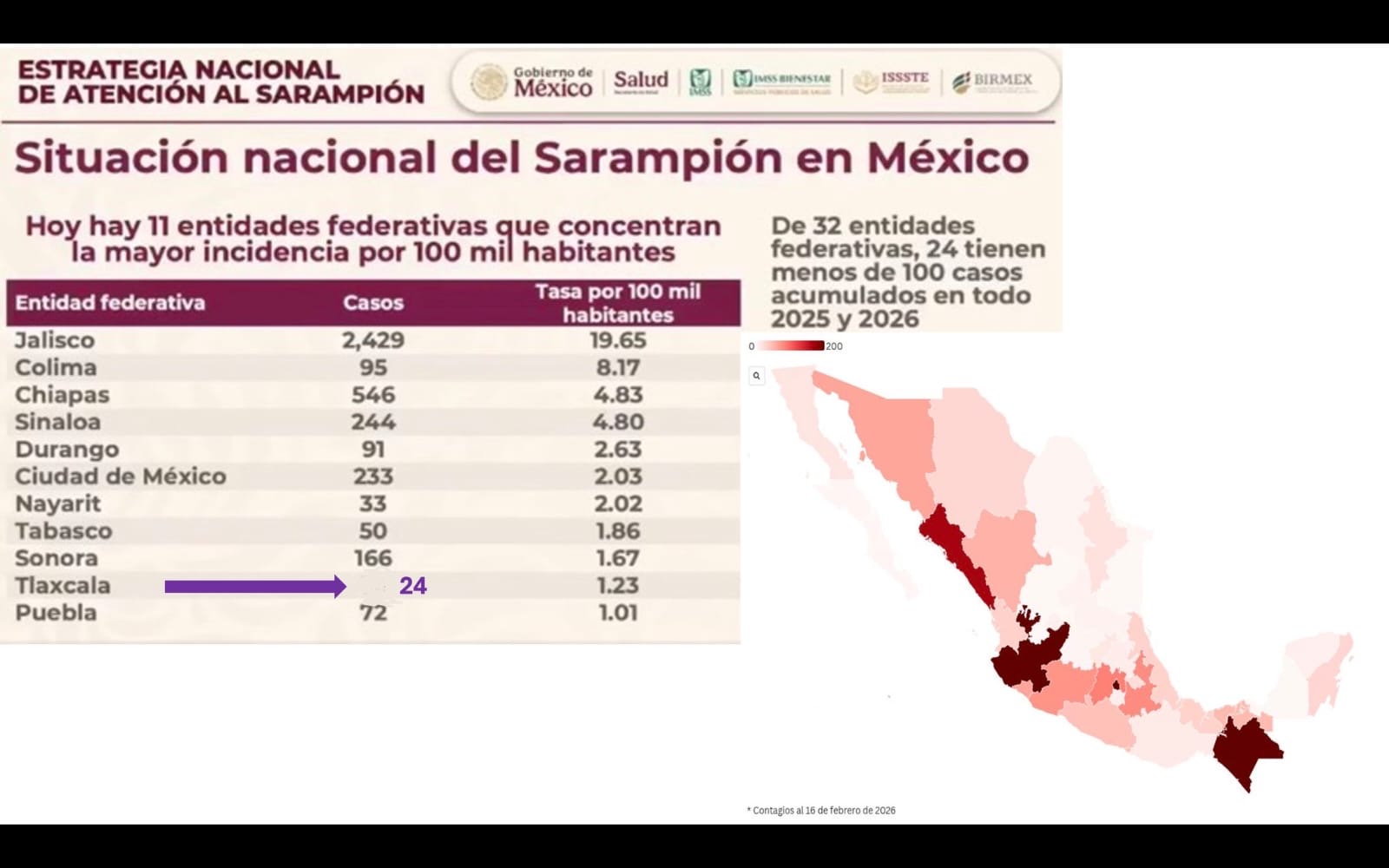 Tlaxcala, Tlax., 18 de Febrero 2026.- Con 24 casos confirmados, el estado de Tlaxcala, se ubica en el lugar número 10 de las entidades con mayor incidencia de sarampión por cada 100 mil habitantes, informó el Seqcretario de Salud en el estado, Rigoberto Zamudio Meneses.