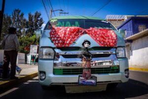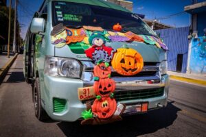 Chiautempan, Tlax.; 1 de noviembre de 2025.- La línea de transporte colectivo TUXSAG celebró el Día de Muertos decorando sus unidades con motivos alusivos a la tradición, incluyendo flores, calaveras y otros elementos típicos de la temporada.